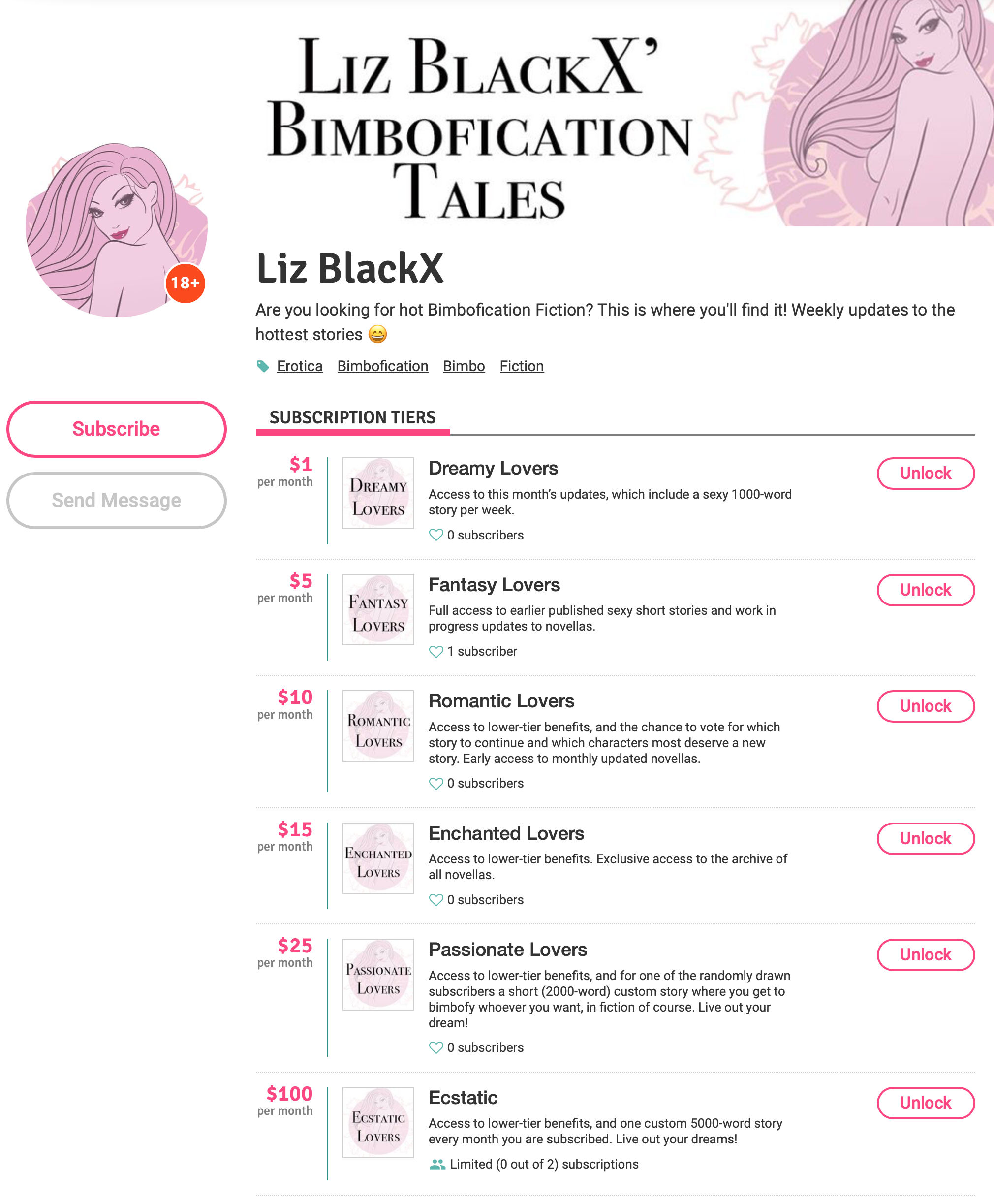 This SubscribeStar is where you can find all Liz BlackX’s Bimbofication stories in one spot. Get access to previously published stories as well as the Subscribe Star Adult exclusive: ‘Bimbo by Scent!’