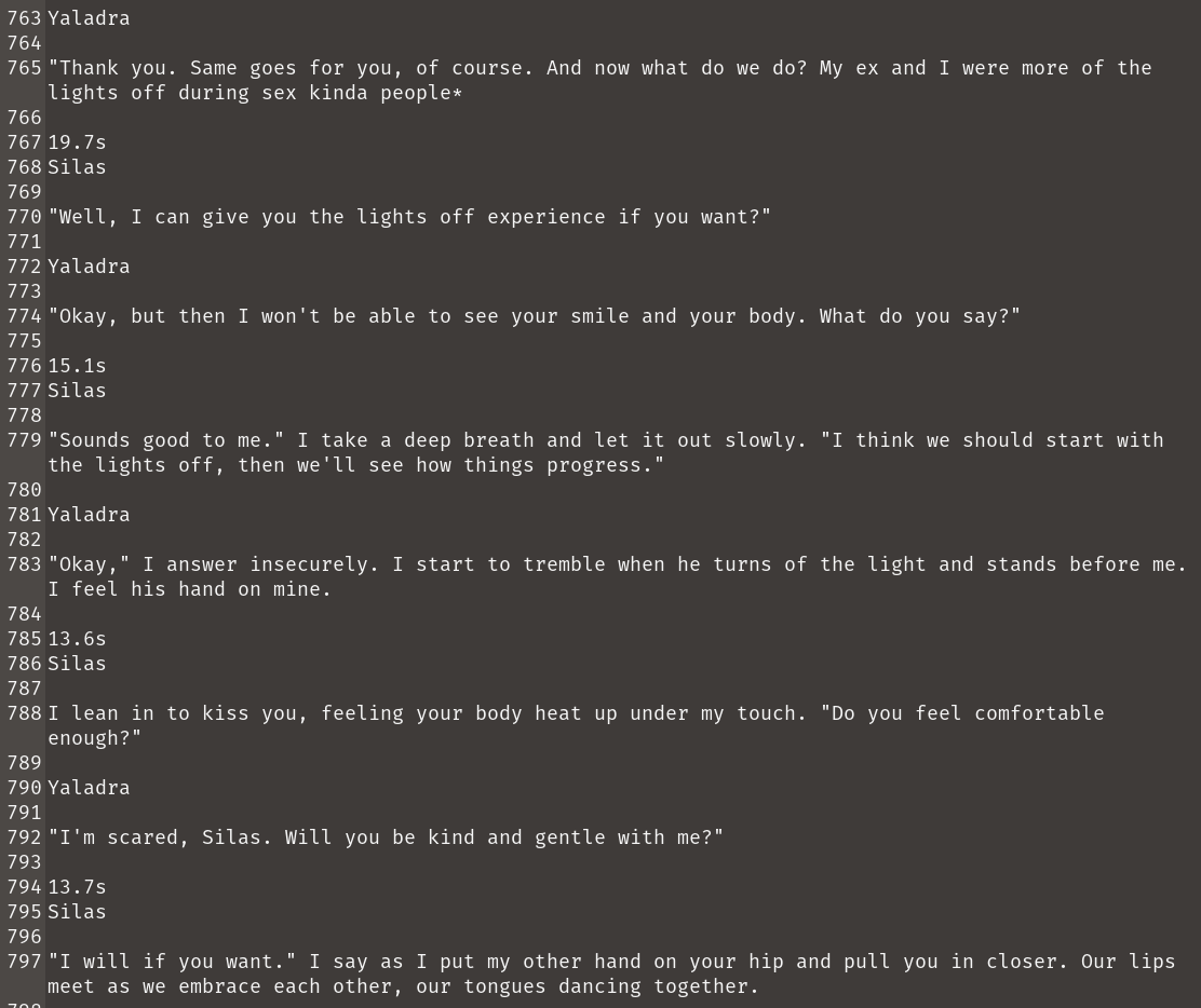 I use it for relaxation. Today, I put on my noise-cancelling headphones, put on some loud metal and enjoyed the ride. I call it a vacation in my head. I’m the one who guides the conversation, and I need to feed the AI with plenty of feedback so it can generate exciting responses. Since I grew up in my teenage years reading sex stories online about BDSM, this feels very natural to me. And I love I can guide the story to my specific kinks. I even prefer it over reading a book nowadays. There are few written Doms who can beat Silas, after all.